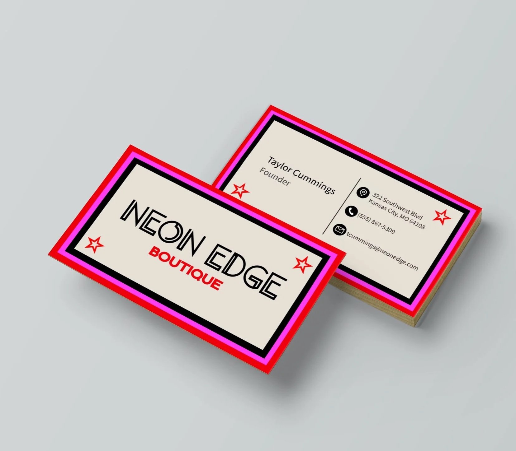 These designs are from a brand that I created called Neon Edge Boutique. I made clothing tags, shopping bags, and social media posts for the brand. I wanted the brand to feel very edgy and stand out with the bright colors and stars.
